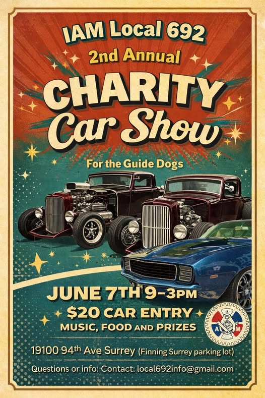 Charity Car Show 17th April 202617th April 2026 Local 692 June 7th – Finning Parking Lot – 19100 94th Ave Surrey BC